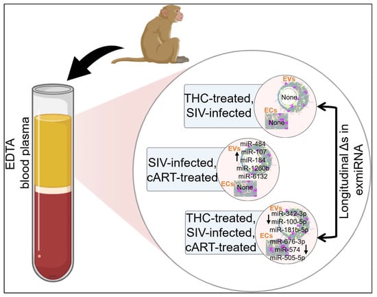 These data substantially improve our understanding of the effect of SIV infection or treatment with cART, THC, and cART+THC on the abundance and compartmentalization of exmiRNAs in EVs and ECs.