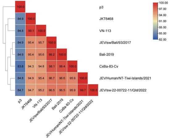 Heat map of the nucleotide similarity between JEV GIV isolates and vaccine strain P3. The value represents the nucleotide similarity between strains, and the similarity is shown from low to high in blue to red. The virus sequence correlation is represented by the left tree.