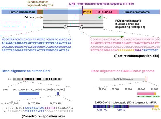 Polyadenylated viral mRNAs, which are usually highly amplified during virus infections, can be targets of LINE1-mediated retrotransposition. Non-retroviral RNA virus sequences have been discovered in the human genome, with characteristics, including a TSD and an integrated poly-A tract, that are indicative of a LINE1-mediated TPRT mechanism [,,]. SARS-CoV-2 is a positive-strand RNA virus. In SARS-CoV-2 infected cells, viral replication and transcription produce large amounts of positive-strand genomic RNA and sub-genomic mRNAs (Figure S1A, reviewed in references [,]). These positive-strand RNAs, which have the same 3′-end and are polyadenylated (Figure S1A), can reach up to 80% of total polyA-RNAs in infected cells [], suggesting that they could be substrates for LINE1-mediated retrotransposition in trans. We have provided experimental evidence that SARS-CoV-2 subgenomic mRNAs can be retrotransposed into the host cell genome through a LINE1-mediated TPRT mechanism in cell culture []. Such retrotransposed viral DNA could be related to some of the reports of prolonged or recurrent RT-PCR positivity in some “long COVID” patients []. Nanopore long-read WGS was used to detect retrotransposed SARS-CoV-2 cDNAs in LINE1-overexpressing cultured cells after viral infection, with signature TSDs, poly-A tracts, and genomic sequence motifs adjacent to the poly-A tails of SARS-CoV-2 sequences that are consistent with the consensus LINE1 EN recognition sequence []. For two of the integrated viral DNAs, we recovered cellular sequences flanking both sides of the integrated viral DNA, with a TSD and a short poly-A tract directly linked to a LINE1 endonuclease (EN) recognition sequence (Figure S1B and reference []). One of the retrotransposed viral sequences was a full-length DNA copy of the nucleocapsid subgenomic mRNA (~1.7 kb, Figure S1B top and reference []). The parental mRNA has a viral leader sequence fused to the body of the nucleocapsid gene at the transcription regulatory sequence (TRS), generated by discontinuous transcription by the viral RNA polymerase (see architectures for SARS-CoV-2 mRNAs [,,], Figure S1A). The integrated viral cDNA detected by Nanopore sequencing matched exactly the sequence of the nucleocapsid subgenomic mRNA (Figure S1B top and reference []). The second retrotransposed sequence was a 5′-end truncated copy of viral RNA that included the 3′ poly-A end and reached the middle of the nucleocapsid gene (~0.55 kb, Figure S1B bottom and reference []), consistent with 5′-truncation being a common feature of LINE1-mediated retrotranspositions [].