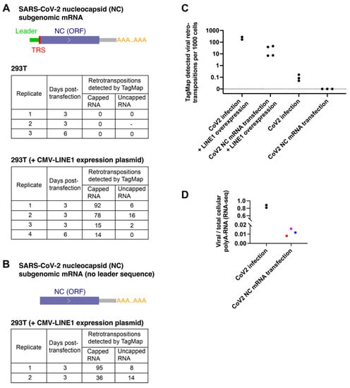 No retrotransposition events were detected by TagMap in cells transfected by viral nucleocapsid mRNA alone. (A,B) Retrotranspositions detected by TagMap in 293T cells transfected with SARS-CoV-2 nucleocapsid (NC) subgenomic mRNA (A) with the leader sequence or (B) without the leader sequence, with or without LINE1 overexpression. 293T cells were transfected by the listed NC mRNA with a concentration of 1 μg RNA per 1mL cell culture medium. For LINE1 overexpression, a CMV-LINE1 plasmid was co-transfected with the NC mRNA, with a concentration of 0.5 μg or 1 μg plasmid per 1 mL cell culture medium. The in vitro transcribed NC mRNA can either express or not express the encoded NC protein depending on whether or not the mRNA was 5′-capped, as listed in the tables. (C) Retrotransposition detected by TagMap in cells infected with SARS-CoV-2 or transfected with NC mRNA, with or without LINE1 overexpression. CoV2 infection + LINE1 overexpression: 678 or 1110 retrotransposition events were detected in ~4000 293T cells (Table 1). CoV2 NC mRNA (5′-capped) transfection + LINE1 overexpression: 14–92 retrotransposition events were detected in ~2000 293T cells (A). CoV2 infection: 1–2 retrotransposition events were detected in ~12,000–20,000 hESC-ACE2 or Calu3 cells (Table 1). CoV2 NC mRNA (5′-capped) transfection: No retrotransposition events were detected in ~20,000 293T cells (Figure 2A). (D) Fractions of viral poly-A RNA relative to total cellular poly-A RNA in cells infected with SARS-CoV-2 or in cells transfected with SARS-CoV-2 NC mRNA. For SARS-CoV-2 infected cells, Calu3 cell RNA was harvested 2 days post-infection; RNA-seq data were from a previous publication []. For cells transfected with NC mRNA, 293T cells cultured in 24-well plates were transfected by 0.5 μg (red dot), 1 μg (magenta dot), or 2 μg (blue dot) RNA per 1mL cell culture medium for 6 h and then lysed for extraction of cellular RNA and poly-A RNA-seq using the same method that was used for infected cells.