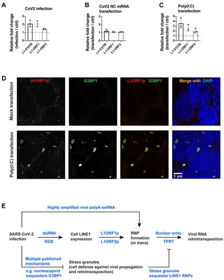 SARS-CoV-2 infection and related cellular stress, but not SARS-CoV-2 nucleocapsid mRNA transfection, can induce endogenous LINE1 expression. (A–C) LINE1 mRNA level fold-change detected by RT-qPCR in (A) Calu3 cells infected by SARS-CoV-2 for 2 days, (B) 293T cells transfected by nucleocapsid (NC) mRNA (~1.8 kb with polyA), with 0.5 μg RNA per 1mL cell culture medium for 24 h, or (C) 293T cells transfected by a synthetic analog of double-stranded RNA, Poly(I:C) (HMW, 1.5–8 kb), with 2 μg per 1mL cell culture medium for 24 h. RT-qPCR was performed using L1HS/L1PA(2-6) specific primers targeting LINE1 5′-UTR or ORF1, and L1HS specific primers targeting LINE1 ORF2, on purified cellular poly-A RNA (method and primer sequences following the protocols in a previous publication [], see Materials and Methods). n = 3 independent experiments (biological replicates). Data are the mean ± standard deviation (SD). One-tailed t-test for LINE1 mRNA upregulation in infected/transfected cells: (A) p = 0.098 (L1-5′UTR), p = 0.021 (L1-ORF1), p = 0.303 (L1-ORF2); (B) p = 0.194 (L1-5′UTR), p = 0.379 (L1-ORF1), p = 0.315 (L1-ORF2); (C) p = 0.143 (L1-5′UTR), p = 0.121 (L1-ORF1), p = 0.020 (L1-ORF2). (D) Immunofluorescent staining of L1ORF1p (red) and G3BP1 (green) and merged channels with DAPI staining (blue) in mock-transfected or Poly(I:C) (HMW, 1.5–8 kb) transfected 293T cells. Cells were transfected by Poly(I:C) (HMW, 1.5–8 kb), with 2 μg per 1mL cell culture medium for 24 h. (E) A proposed model for mechanisms involved in LINE1-mediated viral RNA retrotransposition in infected cells. In this model, double-stranded viral RNAs (formed by viral replication and transcription) and reactive oxygen species produced upon SARS-CoV-2 infection can stimulate cell endogenous LINE1 expression. The expressed LINE1 proteins (L1ORF1p and L1ORF2p) can interact with single-stranded viral polyadenylated mRNAs to form ribonucleoprotein complex in trans, which enter the cell nucleus and retrotranspose through a well-known TPRT mechanism. The high level of viral mRNAs in host cells during viral infection increases the chance of their interaction with LINE1 proteins. Cell stress granules, a cell antiviral/anti-retrotransposition defense mechanism, can be attenuated/cleared by SARS-CoV-2 infection. dsRNA: double-stranded RNA. ssRNA: single-stranded RNA. ROS: reactive oxygen species. RNP: ribonucleoprotein. TPRT: target-primed reverse transcription.