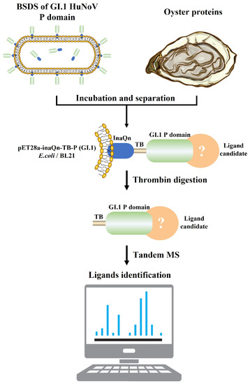 In our previous study, a ligand mining platform for norovirus using a bacterial cell surface display system (BSDS) was constructed [18,19]. As shown in Figure 1, the system uses Escherichia coli (E. coli) as a cellular vector, the N-terminal end of icosahedral nucleoprotein as an anchoring protein, and the P protein of HuNoV as a passenger protein, with a thrombin-recognizable fragment linked between the two to construct a pseudovirus with a large number of displayed P proteins on the E. coli cell surface [22,23]. The P protein in this system retains a similar ability to bind to the receptor as the viral particle [22] and can be used as a bait protein to target the prey protein (the specific binding ligands) out of the complex matrix using the principle of pull down. With the help of BSDS, an oligosaccharide ligand (H2N2F2) was identified from lettuce by glycomics [18], and a proteinaceous ligand (oyster heat shock protein 70, oHSP 70) was mined from oyster tissues by proteomics in our previous studies [19].