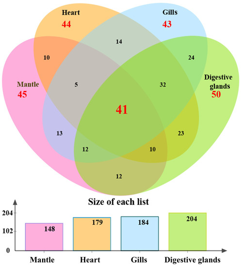 The distribution of 378 differential proteins in four tissues obtained by BSDS I.1P. Among them, 148, 179, 184, and 204 proteins were located in the mantle, heart, gills, and digestive glands, respectively. The amounts of 45, 44, 43, and 50 proteins were unique in each tissue. A total of 41 captured proteins were found in all tissues.