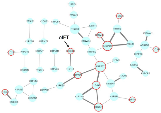 The membrane protein oIFT (K1QDK8) was selected from an independent group that has only two proteins, as shown in Figure 3. IFT is an essential component of the bidirectional transport system within the cilia, mediating the transport of ciliary proteins from the cytoplasm to the tip of the cilia [32]. IFT is divided into two subunits related to forward and reverse transport, respectively. The IFT has the TRAM–Lag1p–CLN8 (TLC) domain, which has four possible functions: catalyzing the synthesis of ceramide-like moieties or activating lipid synthesis, protecting proteins from proteolysis, lipid transporting, and acting as lipid sensors [33]. However no report about the interaction between the oIFT and foodborne viruses was available.