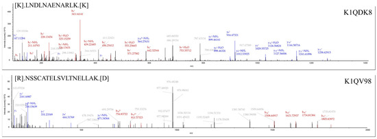In addition, oTNF was selected from the other proteins not included in the PPI network. TNF is ubiquitous in all animals and is a member of the tumor necrosis factor superfamily, a class of cytokines with a conserved TNF homology domain at the C-terminus and a type II transmembrane protein [34]. TNF is a pleiotropic cytokine that mediates a wide range of cellular responses and plays a vital role in the subject’s defense against bacterial, viral, and parasitic infections [35]. In vertebrates, TNF can regulate several critical cellular immune processes, such as phagocytosis, apoptosis, cell differentiation, and proliferation [36,37]. Sun et al. discovered a new TNF from Pacific oysters and found that it could regulate apoptosis and phagocytosis in oyster blood cells, activate immune-related enzymes such as phenol oxidase and lysozyme, and regulate antibacterial activity [38]. Crassostrea hongkongensis had a constitutive expression pattern of TNF, and the transcript levels of TNF were significantly upregulated after artificial contamination of the oyster with Vibrio alginolyticus and Staphylococcus haemolyticus [39]. The tandem MS spectra of unique peptides of oTNF (K1QDK8) and oIFT (K1QV98) are shown in Figure 4.