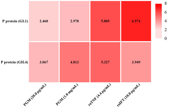 The binding ability of roTNF and roIFT to P proteins of GI.1 and GII.4 HuNoV is shown in Figure 5. The OD450 of negative control (1.0% BSA) was all less than 0.1. PGM was used as a positive control. PGM (20.0 µg/mL) had positive binding abilities to the GI.1 P protein and GII.4 P protein with a P/N of 2.460 and 3.067, respectively. A higher concentration of PGM (1.0 mg/mL) had stronger binding abilities with a P/N of 2.978 and 4.813, respectively. The roTNF and roIFT also showed positive binding ability with the GI.1 and GII.4 P proteins. The binding ability of roTNF with the GI.1 P protein (P/N 5.885) was slightly higher than the GII.4 P protein (P/N 5.327). The binding ability of roIFT with the GI.1 P protein (P/N 6.974) was significantly higher than that of the GII.4 P protein (P/N 3.949). These results may explain why GI.1 HuNoV was more often detected in oyster tissues [12,20,24]. In addition, with the same molar concentration, the roIFT shows higher binding ability with the GI.1 P protein than the roTNF. However, as the ELISA is a semi-quantitative method, a more accurate method, such as the Biacore SPR system, should be used to compare the binding ability between the above proteins and HuNoV in the follow-up study.