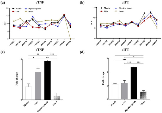 The mRNA levels of oTNF (a) and oIFT (b) in four oyster tissues from December 2021 to September 2022. The average fold change (mRNA level in tissue/mRNA level in the heart) of mRNA levels of oTNF (c) and oIFT (d) in four different tissues. (*, p < 0.033; **, p < 0.002; ***, p < 0.001).