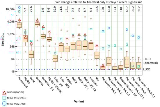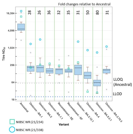 Neutralising antibody titres of a panel of triple-vaccinated human participant sera determined with FRNT against authentic SARS-CoV-2 variants. A panel of 10 sera from triple-vaccinated human volunteers was assessed at UKHSA with FRNT over a dilution range of 1/20 to 1/40,960 with 10 authentic SARS-CoV-2 variants. Data are presented as median and interquartile ranges of titre ND50. Fold changes relative to the ancestral virus were calculated with regression analysis using a linear mixed-effect model and are presented where the difference is significant (two-way ANOVA with Tukey’s post hoc test). The lower limit of detection (LLOD) of 1/20 is indicated by the blue dotted line. The lower limit of quantification (LLOQ) of 1/58, as determined for the ancestral assay, is indicated by the grey dotted line. Neutralisation titres of the NIBSC WR 21/234 and 21/338 are presented as a green box and a blue circle, respectively.