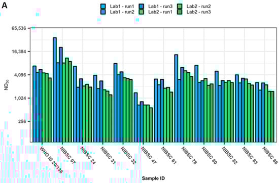 Convalescent plasma were obtained from NHS Blood and Transplant (NHSBT). Plasma samples were obtained from 11 individuals who had recovered from a confirmed SARS-CoV-2 infection between May and June 2020. The plasma were screened using an in-house pseudovirus neutralisation assay (methods described below) prior to their admission into this study. The results of this screening assay are shown in supplementary Table S1. Sera from participants who had received three doses of first-generation vaccine (Wuhan-based) were collected as part of the ESCAPE study as previously described []. This serum panel was collected at a median of 72 days post-booster, involving 10 UKHSA staff volunteers following three doses of vaccine. These participants had received an initial two-dose course of either Comirnaty (n = 4) or Vaxzevria (n = 6). All participants received an mRNA booster vaccine, and one of the participants tested positive for COVID-19 in the interim. Three standards were included in this study: NIBSC 20/136, NIBSC 21/234, and NIBSC 21/338. The WHO IS 20/136 and NIBSC 21/234 reagents are pools of several pre-Alpha convalescent plasma [,]. NIBSC 21/338 is a pool of plasma from 265 individuals who are both vaccinated and convalescent following an Alpha, Beta, or Delta infection [].