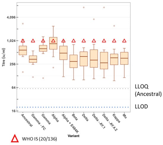 - NIBSC. WHO International Standard 1st International Standard for Antibodies to SARS-CoV-2 Variants of Concern NIBSC Code: 21/338. 2022. Available online: https://www.nibsc.org/documents/ifu/21-338.pdf (accessed on 12 December 2022).
