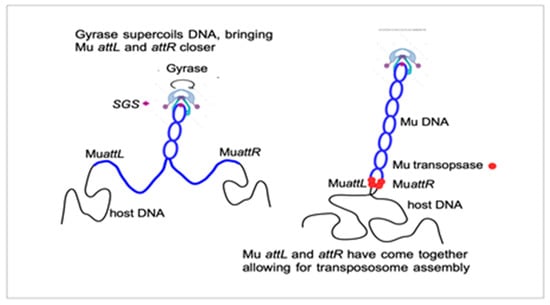 In 1995, a final collaborative paper on the Mu gyrase SGS mechanism was published, reporting on the analysis of the biochemical reaction steps that progressed or were delayed after induction of Mu lysogens that lack the SGS. Transcription and protein production occurred normally. Strikingly, the step of strand cleavage at Mu ends and strand transfer to a new location was delayed by 40 min without the SGS. The critical step promoted by gyrase at SGS was, thus, the assembly of a functional transpososome [36]. This observation, made in vivo on a full-length Mu DNA, was extending to "real life" the in vitro experiments on very short mini-Mus, consisting of just the two ends of the genome, showing that these need to be properly aligned and synapsed in a defined topological way before DNA replication [37,38]. When discussing the requirement for a central location of the SGS in Mu, Martin used to draw the sketch shown in Figure 1. It suggests that the extrusion of a Mu-containing domain within the context of the bacterial nucleoid helps to bring Mu ends together prior to transpososome assembly.