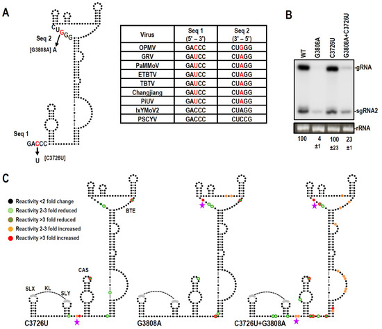 Primers used for SHAPE probing were: OPMV_R1: 5′-GGATGGGAGTGACCACCAC (positions 4235–4217), OPMV_R2: 5′-CAGAACCCTCAGTTTGACTAC (positions 4008–3988), PEMV2_R1: 5′-AGGAAACAGCTATGACC (positions 4319 to 4302), PEMV2_R2: 5′-CGCGTTTGTGATCTTTTTGG (positions 3959 to 3940). For primer extension reactions, 2.5 µM of PET-labeled and 6-carboxyfluorescein (FAM)-labeled oligonucleotides were used with 6 pmoles of unmodified RNA (for sequencing reactions) or NMIA- and DMSO-treated RNA (sample reactions). SuperScript III reverse transcriptase (Invitrogen) was used for reverse transcription reactions as previously described [38,39]. To perform fragment analysis, cDNA products with ladders generated by Sanger sequencing were sent to Genewiz. Files related to fragment analyses were processed and analyzed using QuShape [40]. To verify that QuShape correctly subtracted the background from the corresponding peak positions, manual adjustments were implemented. RNA secondary structures were initially obtained using mFold [41] and modified by phylogenetic comparisons.