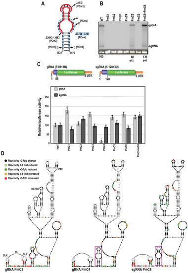 PEMV2 CAS is important for virus accumulation and efficient translation of the gRNA reporter construct. (A). Locations of mutations in the CAS hairpin. Names of mutations are bracketed. Red lines indicate some of the nucleotides that were altered or deleted. Blue shading denotes residues deleted in PmC4. (B). RNA gel blot analysis of total RNA extracted from systemically infected N. benthamiana leaves following agroinfiltration with either PEMV2 WT or derived CAS mutants. Ethidium bromide-stained 26S rRNA was used as a loading control for normalizing band intensities. (C). PEMV2 reporter constructs containing complete 3′UTR and 5′ end non-coding (orange) and coding (blue) sequences as previously described [27]. Relative luciferase activity of constructs was assayed in protoplasts. Error bars denote standard deviation for three independent assays. ‘*’ Denotes statistical difference with p < 0.05 analyzed using the t-test. (D). SHAPE RNA structure probing of PEMV2 gRNA and sgRNA CAS mutants. Dot colors represent changes in nucleotide reactivity in the mutant construct relative to WT (see legend to Figure 5). Star indicates position of the mutation.