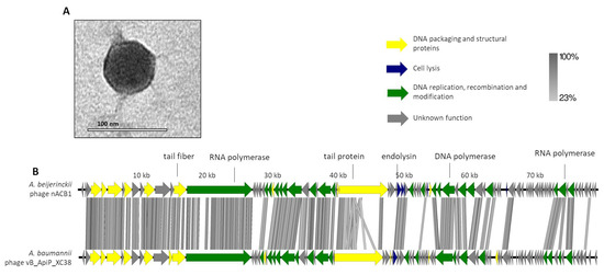 Morphological and genomic analysis of A. beijerinckii phage nACB1. (A) Transmission electron negatively stained with 2% uranyl acetate. (B) Genome map of ACB1 with predicted 95 ORFs numbered and coloured (yellow, green, blue, and gray) according to their predicted functions, and compared using tbBLASTX within EasyFig (Blast minimum length of 100 bp) against the closest phage VB_ApiP_XC38 (NC_055823).A detailed description of the genome can be found in Table S1.