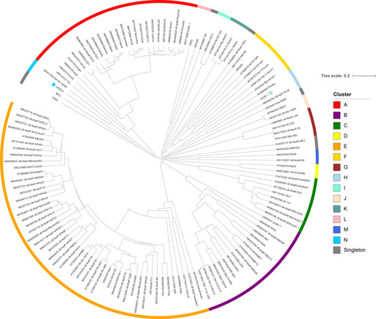 - Letunic, I.; Bork, P. Interactive Tree Of Life (iTOL) v5: An online tool for phylogenetic tree display and annotation. Nucleic Acids Res. 2021, 49, W293–W296. [Google Scholar] [CrossRef] [PubMed]