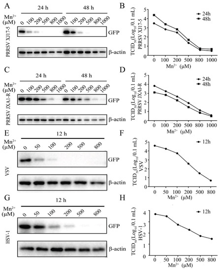 Mn2+ exerts antiviral functions against PRRSV, VSV, and HSV-1. (A–D) Marc-145 cells were pretreated with Mn2+ (0, 100, 200, 500, 800, and 1000 μM) for 24 h, and then infected with 0.1 MOI HP-PRRSV-GFP XJ17-5 (A,B) or HP-PRRSV-GFP JXA1-R (C,D) for 24 h and 48 h, respectively. (E–H) The 3D4/21 cells were pretreated with Mn2+ (0, 50, 100, 200, 500, and 800 μM) for 24 h, and then infected with 0.001 MOI VSV-GFP (E,F) or 0.01 MOI HSV-1-GFP (G,H) for 12 h. The GFP and β-actin protein levels were detected using Western blot analysis (A,C,E,G), and the virus titers in the supernatants were examined by TCID50 assay (B,D,F,H).