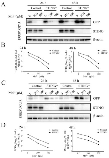 Mn2+ mediates antiviral functions against PRRSV in the STING-independent manner. The STING-/- Marc-145 cells and normal Marc-145 control cells were pretreated with Mn2+ (0, 200, and 500 μM) for 24 h, and then infected with either 0.1 MOI HP-PRRSV XJ17-5 (A,B) or 0.1 MOI PRRSV JXA1-R (C,D) for 24 h and 48 h, respectively. The cell samples were collected and subjected to Western blot analysis using anti-GFP, anti-STING, and anti-β-actin (A,C). The virus titers in the supernatants were detected using TCID50 assay (B,D).