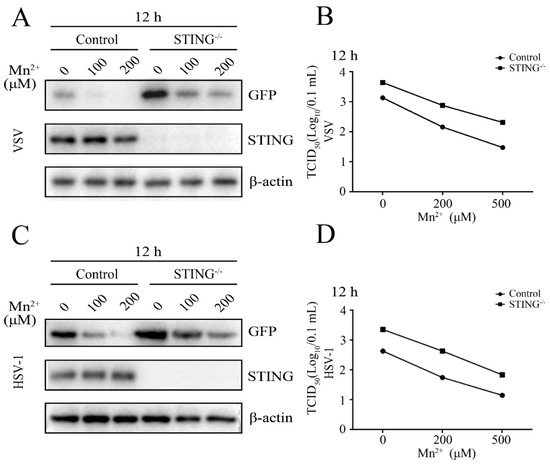 Mn2+ mediates antiviral functions against VSV and HSV-1 in the STING-independent manner. (A,B) STING-/- 3D4/21 cells and normal 3D4/21 control cells were pretreated with Mn2+ (0, 100, and 200 μM) for 24 h, and then infected with 0.001 MOI VSV for 12 h. (C,D) STING-/- 3D4/21 cells and normal 3D4/21 cells were pretreated with Mn2+ (0, 100, and 200 μM) for 24 h, and subsequently infected with 0.01 MOI HSV-1 for 12 h. The cell samples were collected and subjected to Western blot analysis using anti-GFP, anti-STING, and anti-β-actin (A,C). The virus titers in the supernatants were detected using TCID50 assay (B,D).
