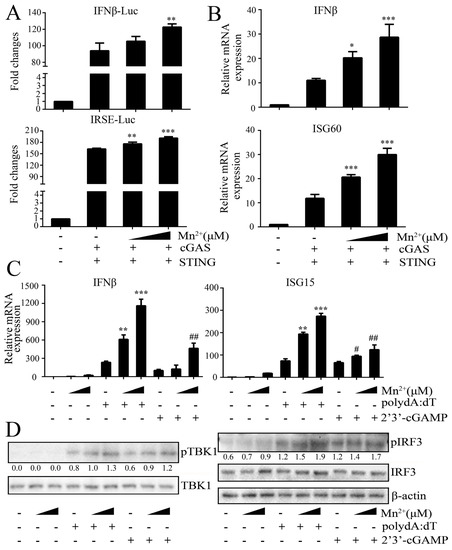 Interestingly, recent publications have suggested the relevance of the cGAS-STING pathway in the process of RNA virus infections [19,20,21,22]. However, it is still largely unclear as to whether Mn2+ plays a role in cGAS-STING pathway-mediated anti-RNA virus infections. Moreover, it has not been fully elucidated as to how Mn2+ mediates its antiviral functions. In this study, we found that Mn2+ exerts a broad antiviral function against various viruses, including some RNA and DNA viruses, which is independent of the cGAS-STING pathway.