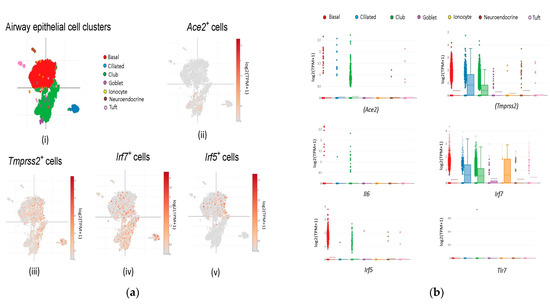 (a) Single-cell sequencing profile of the mouse airway lung epithelial cells. (i) t-SNE color-coded view of all the 7193 airway epithelial cells of the mouse. Differential expression of (ii) Ace2 (iii) Tmprss2 (iv) Irf7, and (v) Irf5 genes in the epithelial cells. (b) Expression profile of targets along with the SARS-CoV-2 receptor genes in the mouse airway lung epithelial cells. Box plots showing the differential expression of Ace2, Tmprss2, Il6, Irf7, Irf5, and Tlr7 in various epithelial cells.