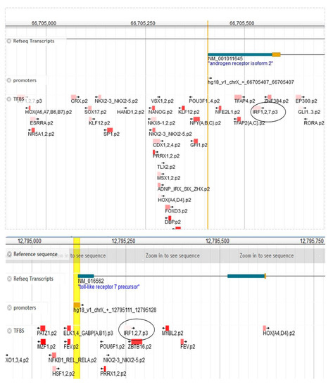 We next sought to understand how the expression of X-chromosome-related genes may relate to covariates that have been associated with disease severity in a particular gender during COVID-19. Among the shortlisted gene candidates, AR, ACE2, and TLR7 were found to be present on the X chromosome. Additionally, the co-localization and expression analysis described above identified an association between the IFN signaling pathway and the SARS-CoV-2 receptor genes. This prompted us to investigate whether IFNs may play an active role in regulating the ACE2 expression levels and thus potentially allow for a positive host response for viral entry. We performed the string analysis of genes including AR, ACE2, TMPRSS2, and the above-mentioned immune factors. It was observed that the SARS-CoV-2 receptor genes were associated with IRF5 via IL6 and AR (Figure S2). The STRING parameters showed the following: the number of nodes, 6; number of edges, 7; average node degree, 2.33; average local clustering coefficient, 0.361: expected number of edges, 1; PPI enrichment p-value, 0.00022 (Table S2). Furthermore, the human promoter region analysis showed that the AR promoter at the chrX:66704897-66705917 and TLR7 promoter at position chrX:12795111-12795128 might regulate the expression of IRFs (IRF1, IRF2, IRF7) at chrX:66705521-66705540 (+strand) and chrX:12795245..12795264 (+strand), respectively (Figure 2). In a sex-based meta-analysis study conducted on COVID-19 patients by Huang et al. [3], the results showed that AR could regulate the expression of ACE2 and TMPRSS2, which can dictate the possible role of sex hormones in disease outcome. However, our analysis tried to decipher the hidden link of immune factors in this cascade of reaction, which may influence the expression of SARS-CoV-2 receptor genes. Based on these analyses, it can be hypothesized that SARS-CoV-2 can use the upregulation of IRF7 and IL6 as a double-edged sword by increasing the pro-inflammation amid tissue injury and by increasing the expression of ACE2 and TMPRSS2 for its entry to infect the cells. This further strengthened our hypothesis that X-related genes can be influenced to accelerate the SARS-CoV-2 infection in the cells.