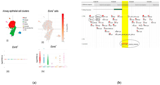 (a) Single cell-RNA sequencing co-localization and the expression profile of estrogen receptors present mouse airway lung epithelial cells along with the SARS-CoV-2 receptor genes. (i) t-SNE color-coded view of all the 7193 airway epithelial cells of a mouse along with (ii) the differential expression of ESRRRA and (iii,iv) the expression profiles of ESRRA and ESRRB expressing epithelium cells. (b) Swiss regulon analysis data showing the estrogen receptor alpha and zinc finger protein ACE2 promoter region. The promoter region analysis showed that ACE2 can regulate the activity of ESRRA and zinc finger proteins. This can be used by the host immune system to counteract SARS-CoV-2 in females.