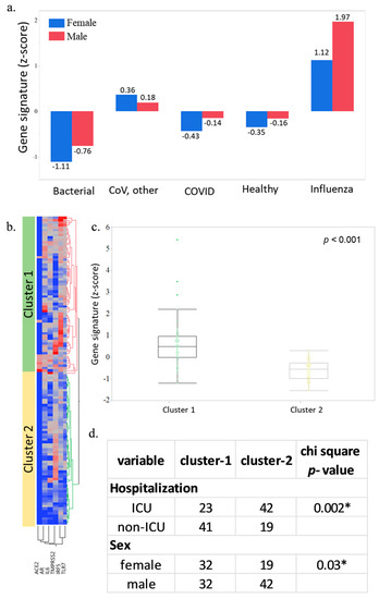 We further explored the clinical implications of our gene signature in two independent datasets. The expression of the 6-gene signature was found to be higher in males compared to females (Figure 4a). In another dataset, hierarchical clustering identified two clusters with significant variation in gene expression. Cluster 1 had a mean of 0.578 and cluster 2 had −0.611 (z-score) (Figure 4b,c). Chi-square analysis identified an association of higher expression of the 6-gene signature with non-ICU patients, along with a significant sexual disparity based on gender.