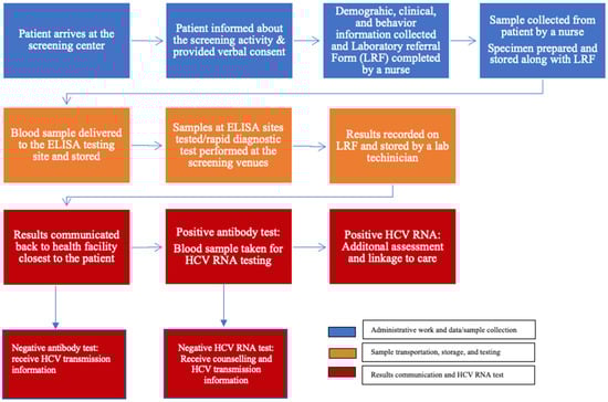 Anti-HCV screening took place in public venues, including stadiums and playgrounds, or near other public places, such as markets, and was free of charge. Each district had at least one screening center. Trained nurses collected demographic information and blood samples from attendees at the screening venues [29,30]. The venous blood (5 mL collected in an ethylenediamine tetraacetic acid tube) samples and laboratory request forms were transported to the nearest of 13 facilities that provided enzyme-linked immune sorbent assay (ELISA) services. Murex-ELISA (version 4.0; DiaSorin S.p.A., Italy) was used across all testing sites. The samples were stored at room temperature (20–25 °C) for less than 12 h without refrigeration and then transported to laboratory facilities for ELISA testing. The sample transportation used a prespecified route to ensure efficient distribution across testing sites. At the testing sites, samples were tested for the presence of HCV antibody (anti-HCV), hepatitis B (HBsAg), and HIV. Starting in April 2019, capillary blood was drawn to test HCV antibodies using SD Bioline™ rapid diagnostic tests (RDTs) at the screening venues. Finger pricks were conducted for the present patients and immediately tested at the screening sites. These tests had near 100% sensitivity and a specificity of 99.4% [31]. Although RDTs were pre-approved by WHO for HCV screening, the Rwandan Ministry of Health, through the national referral laboratory, also conducted an internal validation to evaluate their performance before official use in Rwanda. The findings showed 97% sensitivity and 99% specificity (unpublished internal report). Patients who had a positive antibody test were provided with information on RNA viral load testing and were referred to a specialist for HCV RNA testing at their nearest hospital, where a blood sample for HCV RNA testing was obtained. From 2019, after a decentralization and task shifting intervention, patients were treated at the nearest health center by trained nurses and doctors. Those who screened as anti-HCV positive had to pay the fees associated with HCV RNA testing and additional assessment tests using health insurance or pay out-of-pocket. The cost of screening in Rwanda is approximately USD 1, while HCV RNA costs USD 9, which is equivalent to 10,000 Rwandan francs.