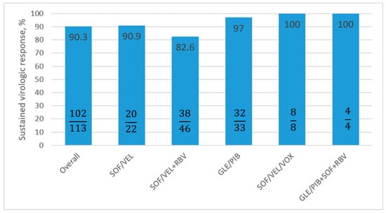 The effectiveness of the most commonly selected treatment (SOF/VEL±RBV) was 11.7% lower than the (GLE/PIB) regimen—SVR 12 PP 97%. The addition of RBV to the SOF/VEL regimen had no influence on the increase in virologic response; SVR PP in the SOF/VEL therapy was 90.9% and for SOF/VEL+RBV was 82.6%