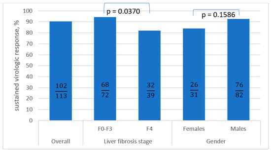 Comparing patients who responded to antiviral treatment to the virologic non-responders, the following differences were noted: older age and liver cirrhosis were noted as potential factors for the lack of response to treatment (Table 6, Figure 2). However, only liver cirrhosis and use of SOF/VEL±RBV in current treatment reached statistical significance (p ≤ 0.05).