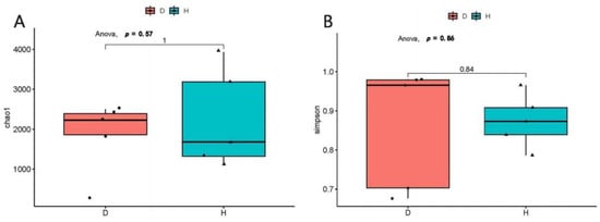 The alpha diversity analyses of intestinal virome in the healthy dogs and the dogs with diarrhea. At the genus level, the Chao1 index (A) and the Simpson index (B) were calculated, respectively.