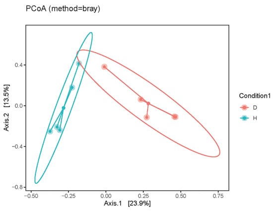 The beta diversity of intestinal virome in the healthy dogs and the dogs with diarrhea were analyzed using principal coordinate analysis (PCoA).