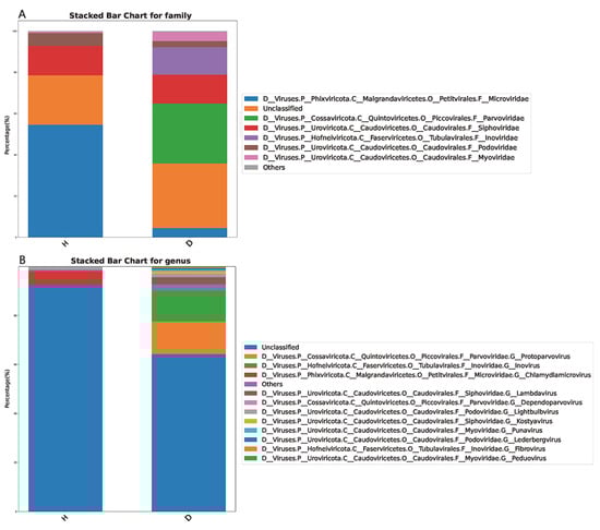 The compositions of intestinal virome in the healthy dogs and the dogs with diarrhea at the family (A) and genus class (B) levels.