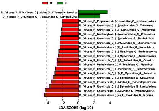 The linear discriminant analysis effect size (LEfSe) of intestinal virome in the healthy dogs and the dogs with diarrhea. LEfSe was performed to search for the taxa in which the relative abundances were significantly different between the two groups, and the LDA Score was calculated and is shown.