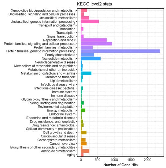 The functional annotations of the dog viral genome were performed by searching the Kyoto Encyclopedia of Genes and Genomes (KEGG) databases (https://www.kegg.jp/, accessed on 1 January 2023). As shown in Figure 6, a total of 45 pathways were predicted using the diamond software, including the replication and repair, nucleotide metabolism, amino acid metabolism, xenobiotics biodegradation and metabolism, carbohydrate metabolism, energy metabolism, folding, sorting and degradation, lipid metabolism, infectious disease: bacterial, and other pathways. The enrichment of KEGG pathways revealed the close relations between the viral functions and the complicated metabolism of their bacterial hosts.