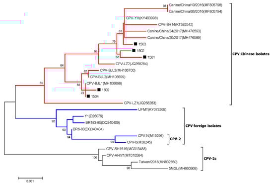 Phylogenetic analysis based on the near-complete genome sequences of CPV strains collected in this study and other representative strains retrieved from GenBank. The scale bar indicates nucleotide substitutions per site. CPV strains collected in this study are labeled with a black solid square (■). GenBank accession numbers of other CPV strains are indicated following the virus strains in the branches.