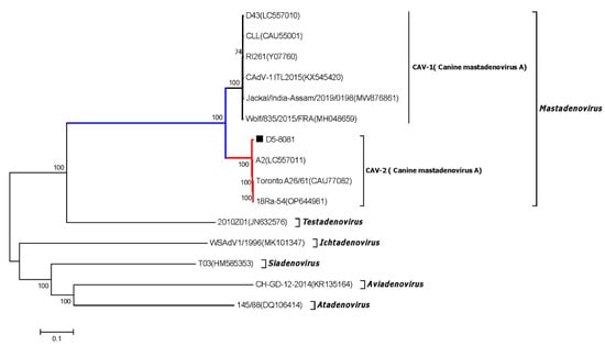 Phylogenetic analysis based on the near-complete genome sequences of CAV-2 strain D5-8081 collected in this study and other representative strains retrieved from GenBank. CAV-2 strain D5-8081 collected in this study are labeled with a black solid square (■). GenBank accession numbers of other adenovirus representative strains in six genera are indicated following virus strains in the branches.
