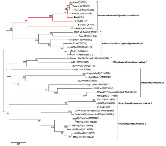 Phylogenetic analysis based on the near-complete genome sequences of AAV-5 strain AAV-D5 collected in this study and other representative strains retrieved from GenBank. AAV-5 strain AAV-D5 collected in this study is labeled with a black solid square (■). GenBank accession numbers of other AAV representative strains in the genera Dependoparvovirus are indicated following virus strains in the branches.