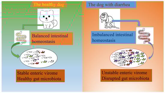 The mammalian gut contains an enormous quantity of bacterial viruses; however, the roles of bacteriophages or phages in shaping the gut microbiome and influencing the host’s health have still been rarely investigated [2]. Several previous studies demonstrated that the viral diversities in the gut virome of different mammalian individuals apparently varied; therefore, there was an urgent need to identify and classify the phages and other viruses in the mammalian gut virome [12,35]. Canine diarrhea is a common intestinal illness which could be caused by viruses, bacteria, parasites, and other pathogens (Figure 10). Viral metagenomics analysis could be applied as a powerful tool to explore new and existing viruses, including canine distemper virus, canine parvovirus type 2, canine amdoparvovirus, the rotavirus, canine herpesvirus, canine papillomavirus, canine bufavirus, canine influenza virus, and canine parainfluenza virus [36,37,38]. Moreover, viral metagenomics could also be used to investigate the pathogens of chronic enteropathy, idiopathic meningoencephalomyelitis, and other diseases [39,40]. In particular, the potential transmission risks of canine viruses to humans and other mammals should also be focused on. Therefore, viral metagenomics analysis might play an essential role in the fields of veterinary medicine for studying the canine gut virome, and might also provide important information for evaluating the roles of animal viruses in public health.