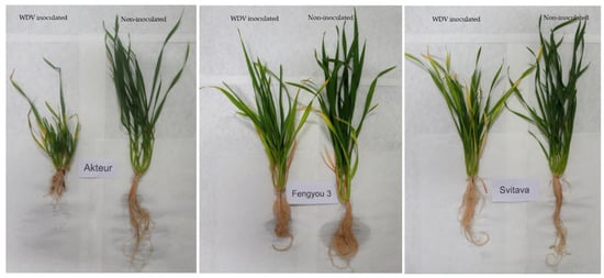 The resistance of the wheat genotypes in this study was assessed by observing the disease symptoms after virus infection and by analysing the virus titre using qPCR. The highly resistance/susceptibility of the Svitava/Akteur genotypes was known from our previous study [16] and was investigated in the case of the Chinese genotype Fengyou 3, which also performed well in the field after virus inoculation. The Svitava and Fengyou 3 genotypes showed mild disease symptoms after WDV inoculation, such as slight leaf yellowing, little dwarfing and only a slight reduction of the root system compared to the non-inoculated control. On the other hand, the genotype Akteur showed very severe disease symptoms associated with severe yellowing and dwarfing and a severe reduction of the root system. These results show good resistance of Svitava and Fengyou 3, as well as high susceptibility of Akteur to WDV (Figure 1).