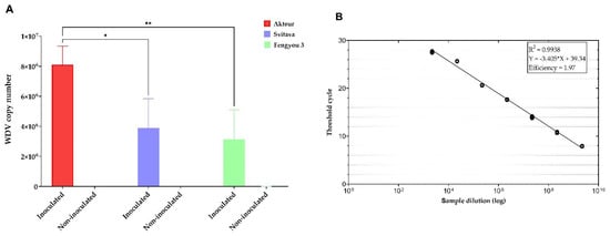 (A) The virus copy number detected in each individual wheat genotype by qPCR, two-way ANOVA and Tukey’s multiple comparison test was applied to detect the statistical significance of the WDV titre in inoculated Fengyou 3 and Svitava compared to Akteur (a susceptible genotype) where * = p < 0.05 and ** = p < 0.01. (B) The calibration curve for SYBR Green I-based qPCR amplification of standard WDV DNA, with the specific set of primers UnivWDVfw and UnivWDVrv [35] calculated based on the WDV copy number in each sample.