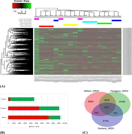 Summary of differential expression in WDV-infected and non-inoculated genotypes. (A) Heatmap of transcript expression and hierarchical clustering analysis of the WDV-infected and non-inoculated genotypes. (B) A bar chart showing the number of differentially expressed transcripts (DETs) in the three genotypes after WDV infection. (C) A Venn diagram showing the overlaps of the DETs of the three genotypes after WDV infection.