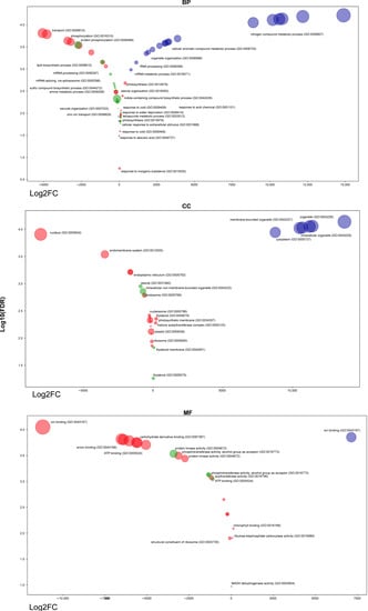 A bubble chart of annotated differentially expressed transcripts (DETs) and classification in the Gene Ontology (GO), with results grouped into three main categories: biological process (BP), cellular component (CC) and molecular function (MF). Bubbles were coloured (red, green and violet) according to the different genotypes (Akteur, Fengyou 3 and Svitava), respectively. Log2 FC = log2 fold of change of transcripts.