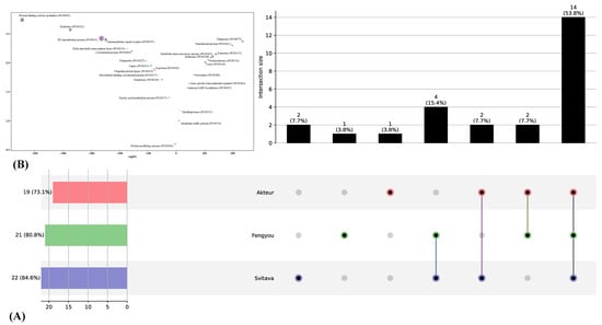 The PANTHER Classification System (v.14.0) was used for the functional statistical enrichment test for the DETs of the Akteur, Fengyou 3 and Svitava genotypes. Next, the obtained Gene Ontology (GO) categories were summarised using Revigo [48]. The result showed that a total of 114 GO terms were populated for the DETs of the Akteur, Fengyou 3 and Svitava genotypes. Of these, 64 (biological process), 28 (cellular component) and 22 GO terms (molecular function) were significantly enriched (p < 0.05) (Supplementary Table S5 and Figure 4).