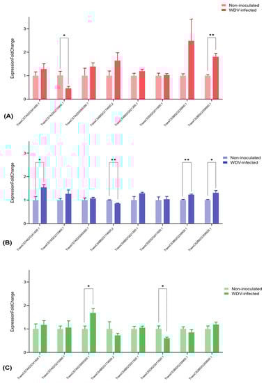 RT-qPCR analyses of eight WDV infection-related transcripts in WDV-infected and non-inoculated (A) Akteur, (B) Svitava and (C) Fengyou 3 genotypes. Each bar represents the mean ± SEM of triplicate assays. T Test, Holm-Šídák method (* = p < 0.05 and ** = p < 0.01).