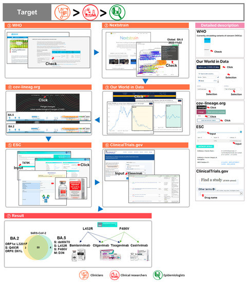 The current dominant SARS-CoV-2 strain worldwide is BA.5 [79,80,81]. Many countries are carrying out vaccinations as a preventive measure against COVID-19 with vaccine and treatment development also underway [82,83]. Many mutations occur in SARS-CoV-2 through evolution, which makes preexisting vaccines ineffective. To combat the continued evolution of SARS-CoV-2, research that targets the mutations is needed [84]. To select effective antibodies and drugs based on mutation data on reported lineages, we suggest the following process [85,86,87].