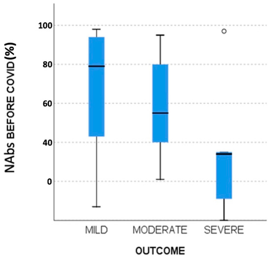 An initial approach to differences in patient outcomes showed that regarding PS, a statistically significant difference of mild versus severe cases (p = 0.041) was observed, while the difference between mild and moderate cases was borderline non-significant (p = 0.052). A difference between severe and mild cases was observed concerning NAbs response levels before SARS-CoV-2 infection (Table 7). As shown in Figure 1, patients with severe disease appeared to have lower NAbs levels before SARS-CoV-2 infection (median time from last NAbs measurement to infection date: 16 days; range: 8–24 days) compared to patients with mild disease (median: 18 days; range 4–27 days, p = 0.04). The mean and standard deviations for NAbs levels were 67.49% ± 28.85%, 59% ± 24.69% and 35.4% ± 37.57% for the groups of mild, moderate, and severe outcomes, respectively. Only four patients (2.4%) had lower than 10% neutralizing antibody levels before COVID-19 diagnosis, and two of them experienced a severe infection.