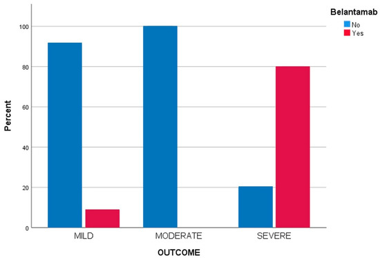 Regarding treatments, despite the various drug types included in the study and their combinations, it was observed that treatment with belantamab mafodotin was associated with adverse COVID-19 outcomes. A total of 47% of patients receiving belantamab mafodotin were male, with a median age of 66.2 years, and a median Nab measurement before the infection of 29.8%. As far as their response to treatment for MM was concerned, five patients had a partial response to therapy (29.4%), five patients had a very good partial response (29.4%), and seven patients had a complete response (41.2%). Seven of these patients received molnupiravir (41.2%) and ten received ritonavir-nirmatrelvir (58.8%). As shown in Figure 2, there was a significantly higher risk for severe SARS-CoV-2 infection in patients that received belantamab mafodotin (p < 0.001) according to the Fisher’s exact test.