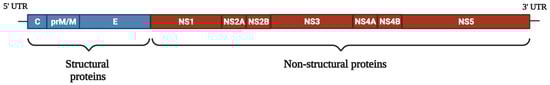 DENV RNA genome organization. The DENV positive-sense RNA genome consists of 11 kilobases (kb) with a single open reading frame (ORF) characterized by the presence of two untranslated regions (UTRs) at both ends of the ORF. The 5′-UTR consists of 95–135 nucleotides with a type I cap-like mRNA whereas the 3′-UTR consists of 114–650 nucleotides and lacks a poly(A) tail, ending in a conserved stem-loop secondary structure [23,24]. The figure was created using Biorender.com (ON, Canada) (accessed on 26 February 2023).