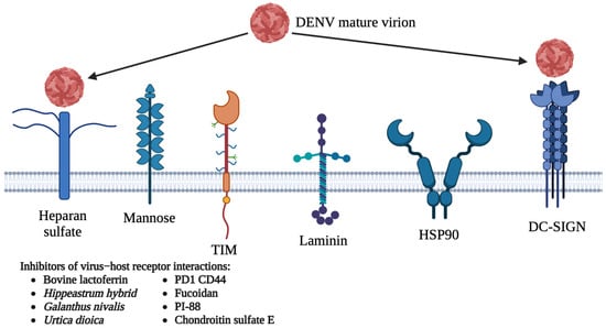 A bite from a DENV-infected Aedes mosquito initiates the infection in humans. DENV can grow and replicate in various cells and organs including kidney, liver, spleen, and lymph nodes, but its major targets are dendritic cells, monocytes, and macrophages. The life cycle of DENV consists of several stages such as viral entry, replication, assembly, and release. First, DENV viral particles attach to the host cells via interactions between DENV surface proteins and their respective host receptors. The proposed host receptors that interact with DENV include dendritic cell-specific intracellular adhesion molecule-3-grabbing non-integrin (DC-SIGN), heparan sulfate, human C-type lectin-like molecule (CLEC5A), and mannose receptors. Studies have revealed that domain III of the DENV E protein is responsible for receptor recognition to allow DENV entry into host cells via receptor-mediated or clathrin-dependent endocytosis [34,35]. In addition, direct entry of DENV into host cells could also take place through the virus–host cell membrane fusion process [36,37,38].
